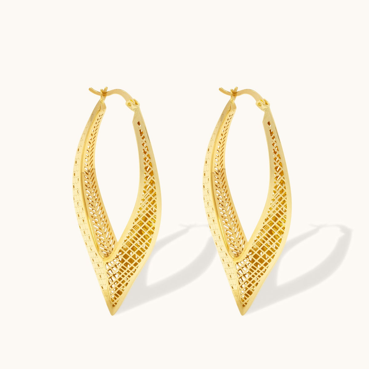 Embrace the beauty of nature with Geometric Hollow Tear Drop Hoop Earrings, handcrafted from solid gold. Each earring features a delicate tear drop shape with a mesmerizing honeycomb pattern, reminiscent of bees buzzing among blooming flowers.