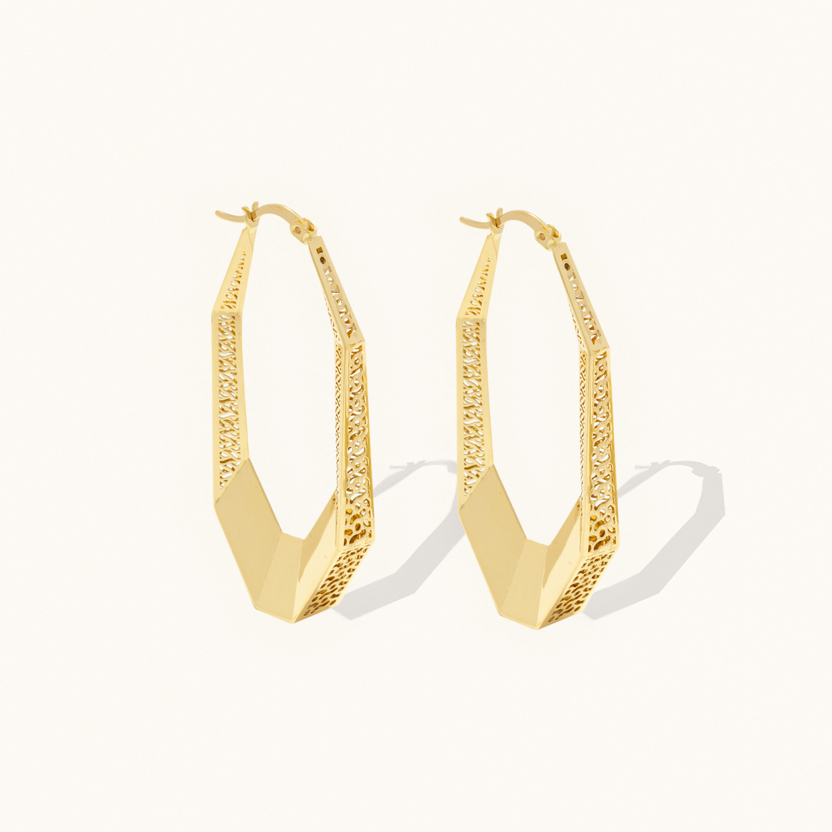 Ignite your style with our Golden Flame Earrings, a bold blend of elegance and intensity. Crafted from solid gold, these earrings feature a unique heptagon shape adorned with intricate, fire-inspired patterns. Designed to symbolize passion and inner strength, the Golden Flame Earrings are perfect for those who wish to make a striking statement.