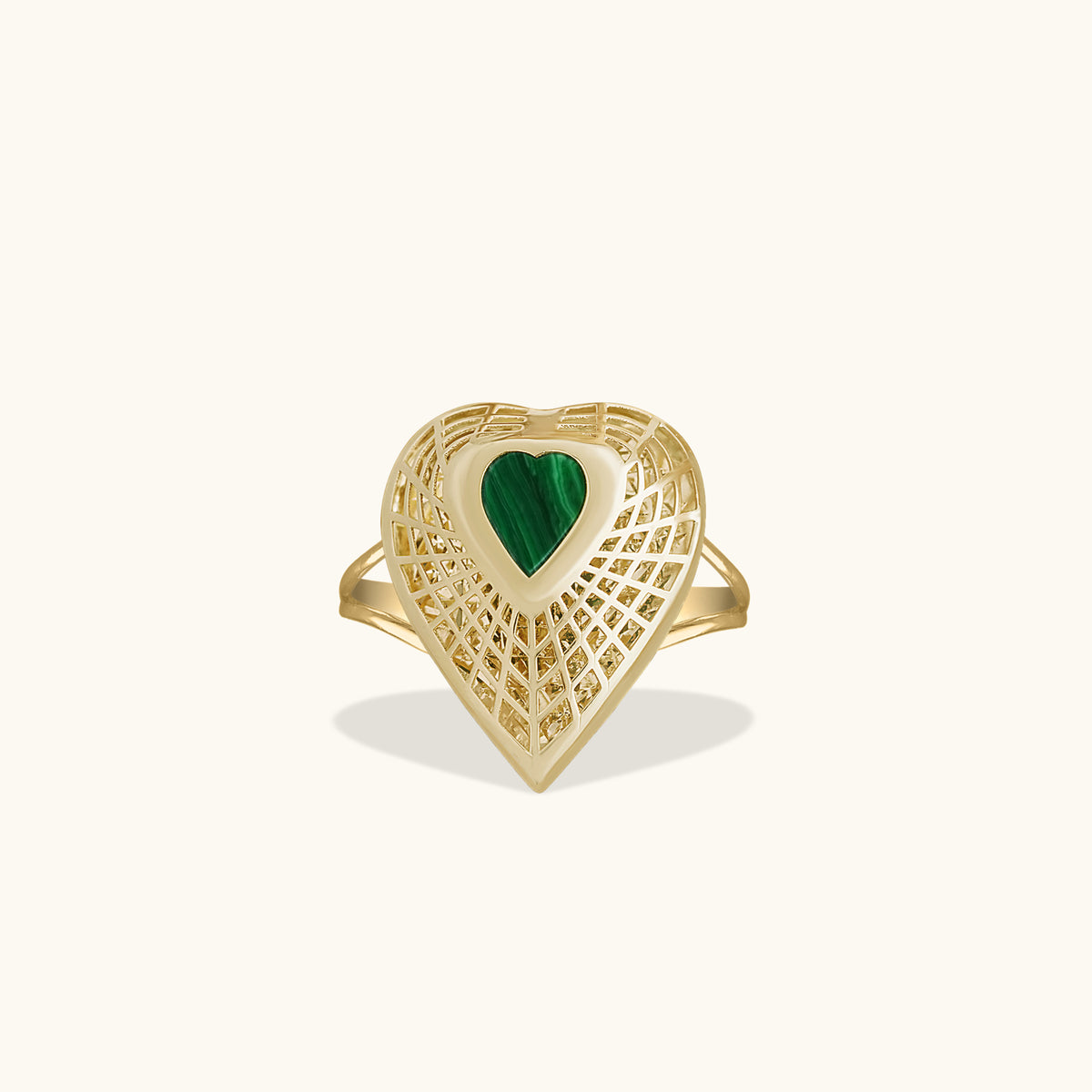 Let your heart echo the rhythm of nature! Crafted in your choice of solid gold or sterling silver with gold vermeil, this bold statement ring features a delicate lattice design inspired by forest canopies, encircling a deep green heart-shaped malachite — a stone known for its grounding energy.